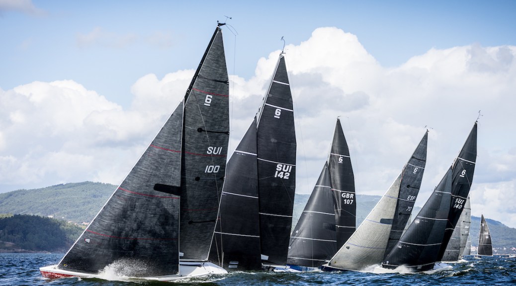 The opening day of the Six Metre European Championships Trofeo Xacobeo at the Real Club Nautico de Sanxenxo got off to a damp and windless start, but by mid-afternoon a light southerly breeze had filled in and the race committee was able to run the opening race of the eight-race series in a light, variable and very shifty southerly. The beautiful Six Metres made an ethereal sight as the sun finally broke through the mist towards the end of the race.